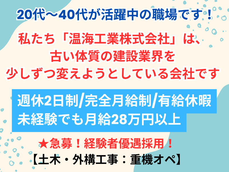 | 給与 | 月給28万円~40万円 ※経験によって異なる 月給30万円~40万円 ※重機オペ経験・中型免許あり ※能力・経験等を考慮の上決定します □昇給随時あり □賞与年2回(業績による) □家族手当あり |