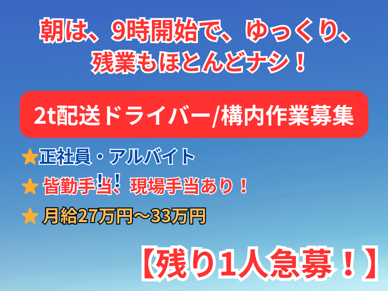 | 勤務時間 | 9:00~18:00 ※配送先により前後します 構内作業のみ 9:00~18:00の間で1日3h~ |